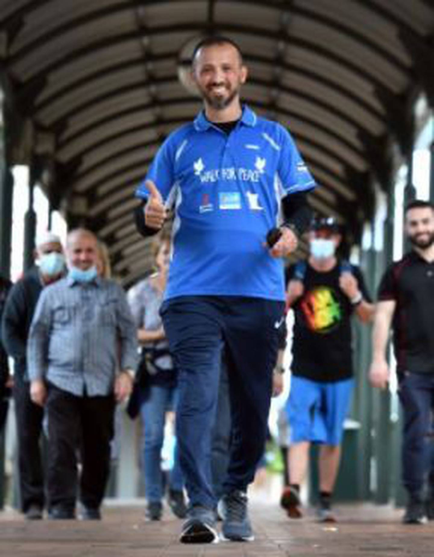 Temel Atacocugu was surrounded by friends at the start of his walk from Dunedin's Octagon on March 1. Photo / Peter McInstoshÂ