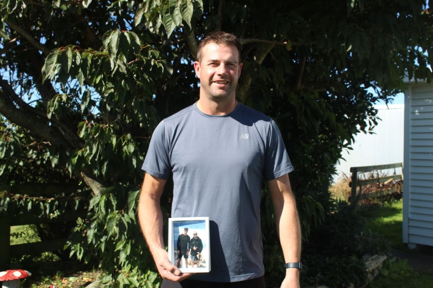 Simon Adams holding an image of his son who drowned in 2021. Photo / Alyssa Smith