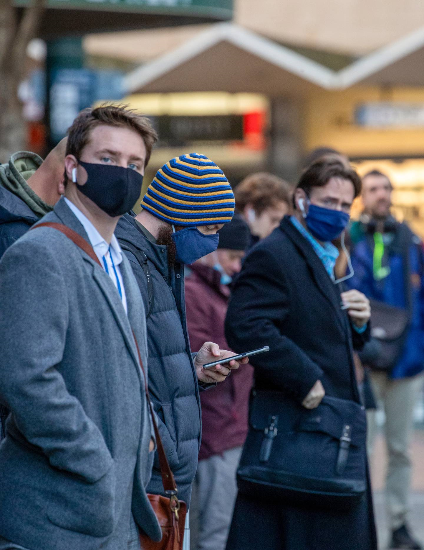 Face masks were donned by commuters in Lambton Quay yesterday. (Photo / Mark Mitchell)