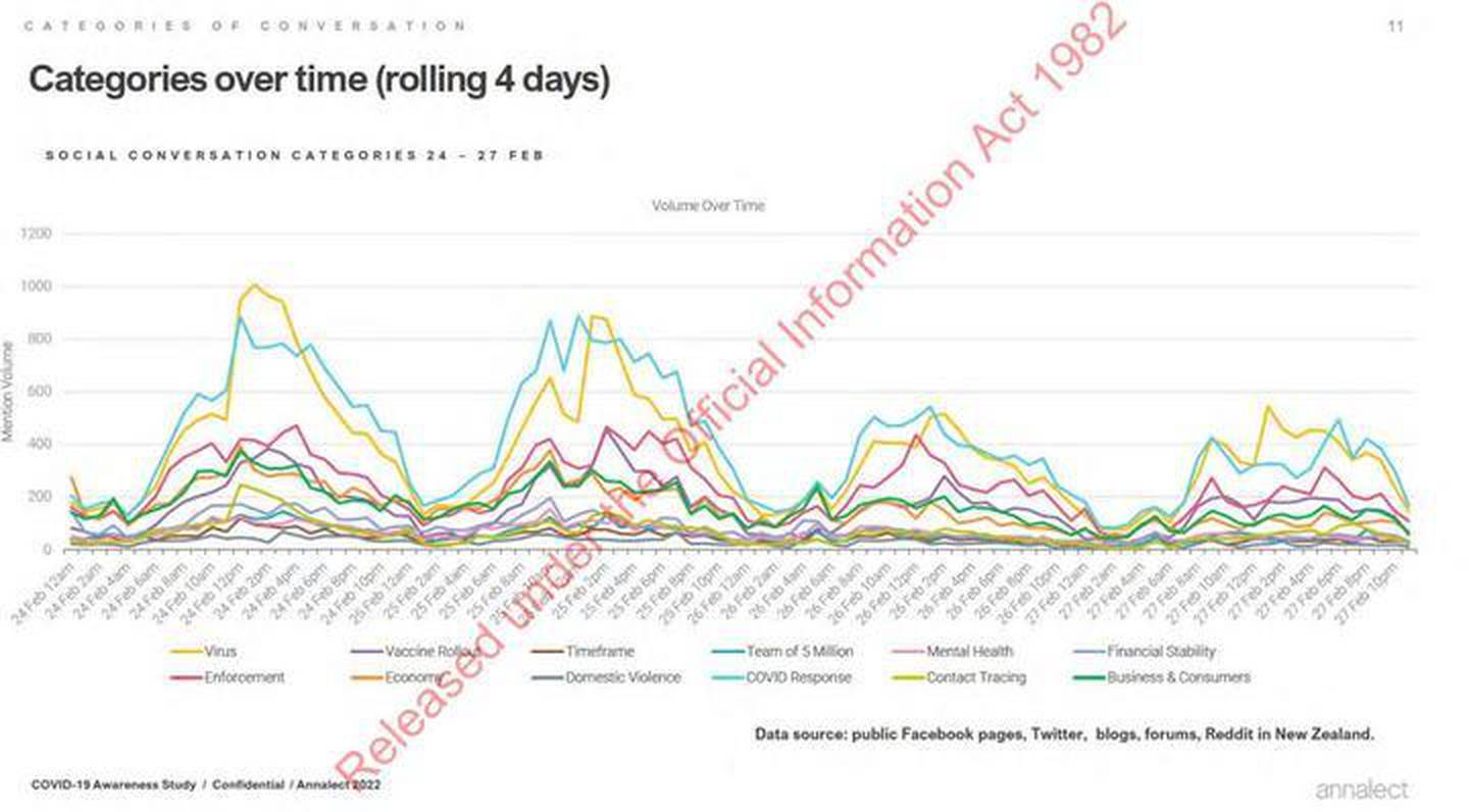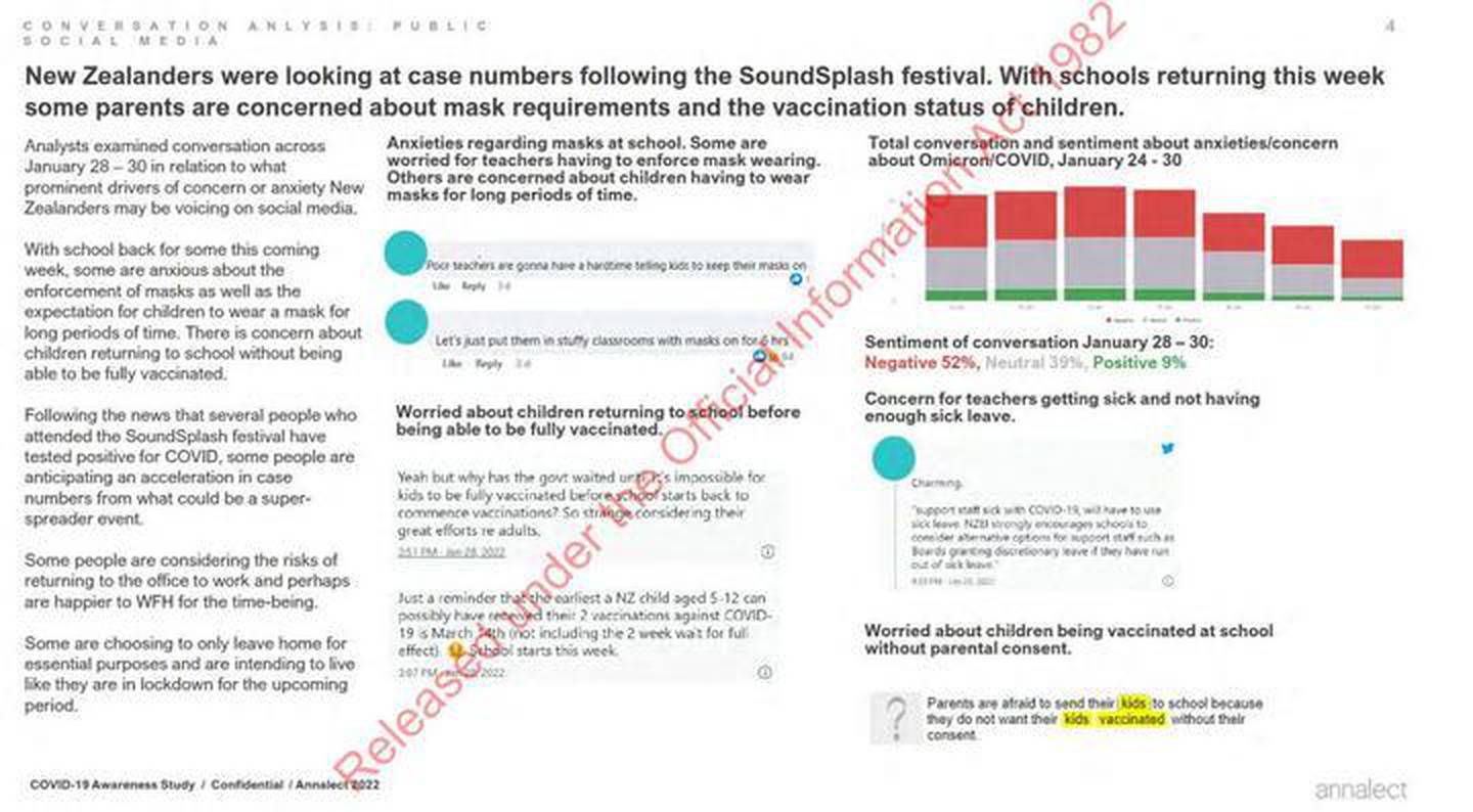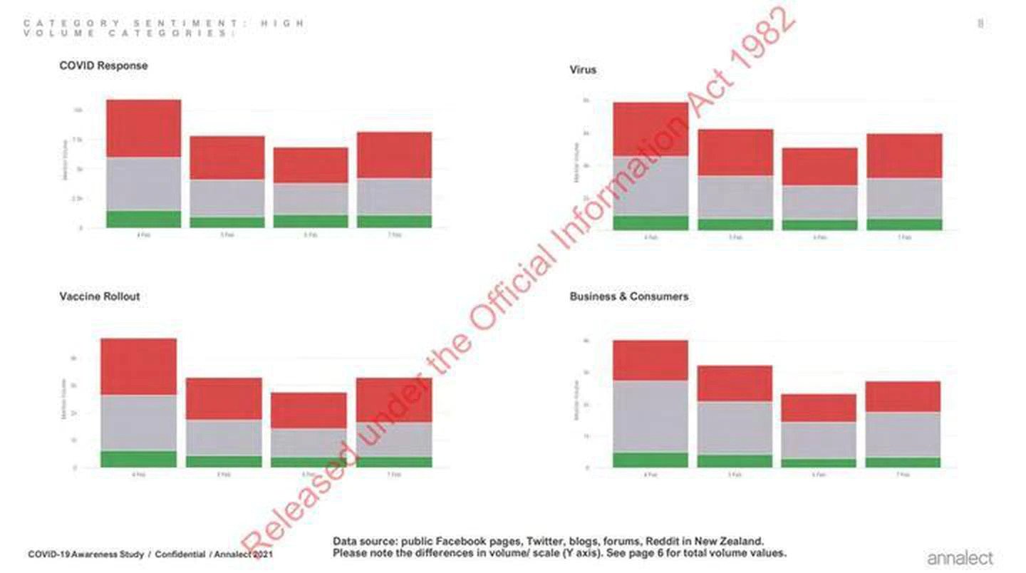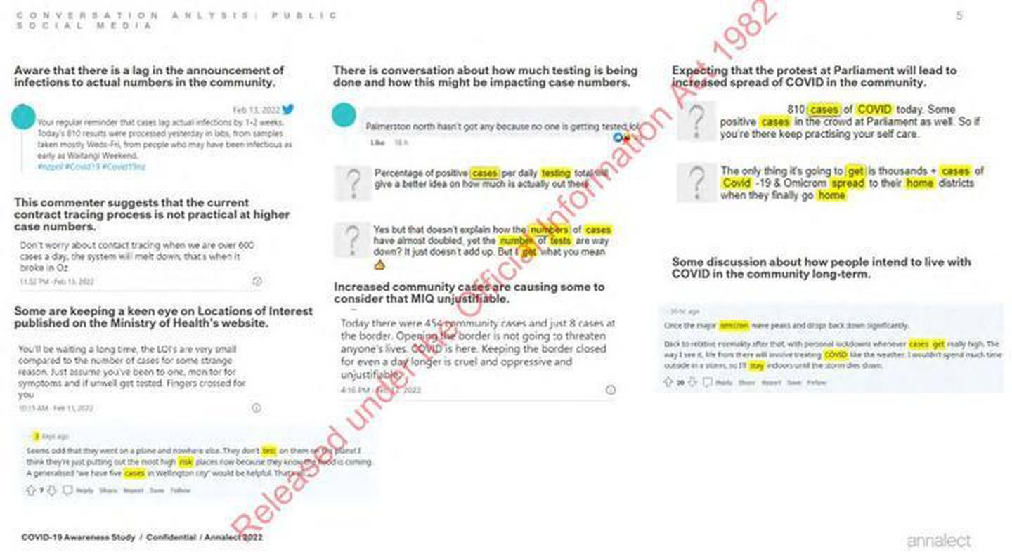Documents released to RNZ show Annalect surveilled public comments on Facebook, Twitter, Reddit and other sites, about current topics like "Covid response", "virus", "vaccine rollout", "economy", "business and consumers", "contact tracing" and "team of five million", posted by New Zealanders.Â