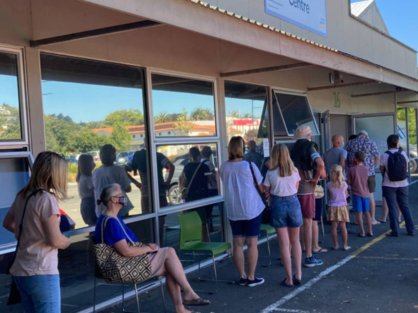 People queue for vaccinations and booster shots at the Nelson centre on Paru Paru Rd after nine new cases were found in nearby Motueka. Photo / NZMEÂ