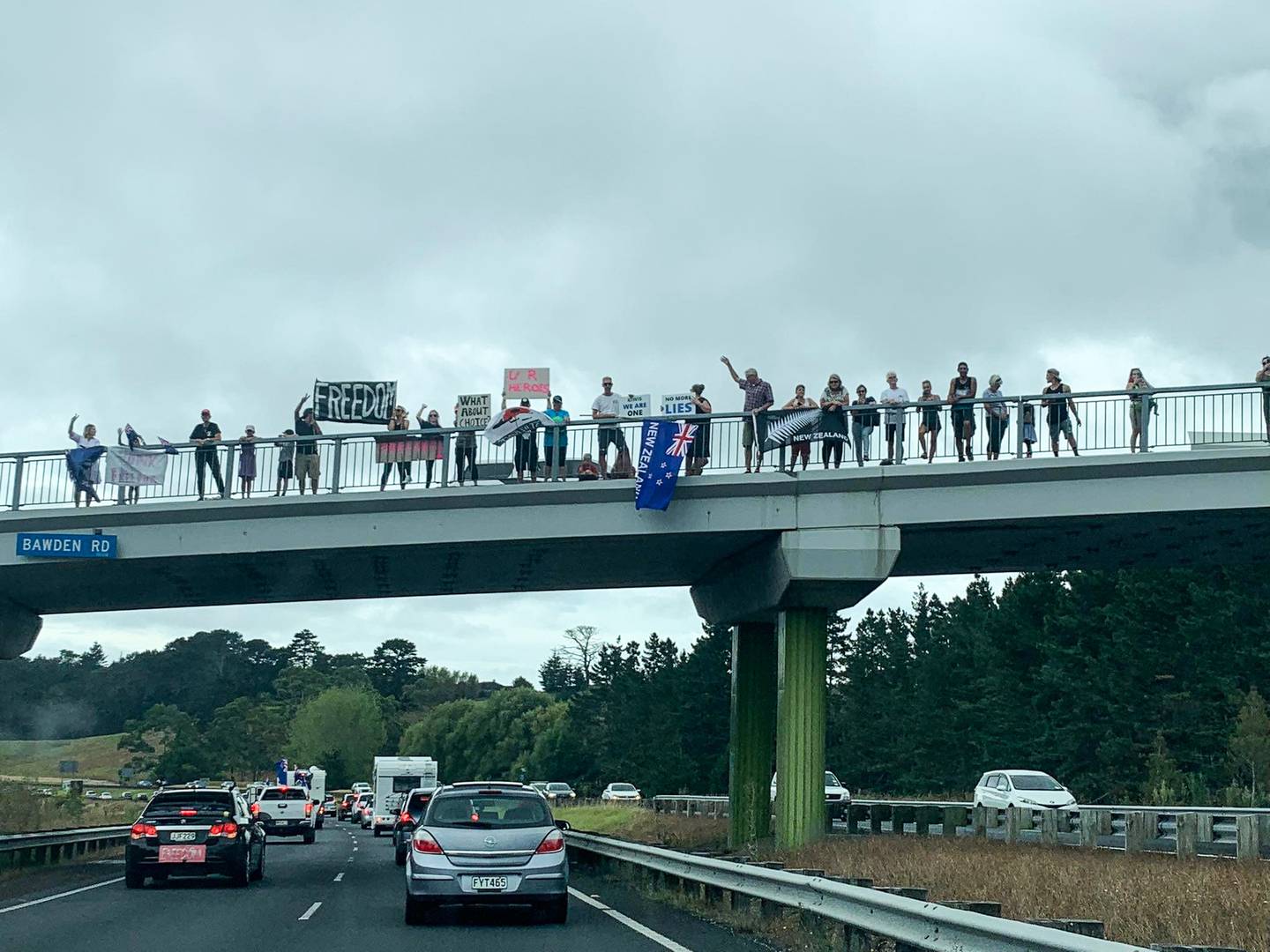 Protesters on the Bawden Rd overbridge in Auckland. Photo / Brayden VerseyÂ