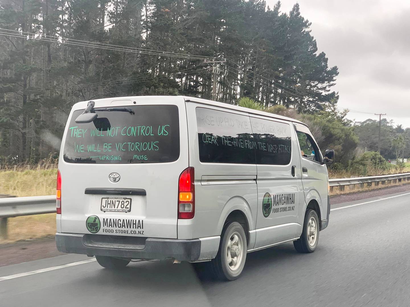 Protest van spotted on the Northern Motorway near Bawden Rd overbridge. Photo / Brayden VerseyÂ