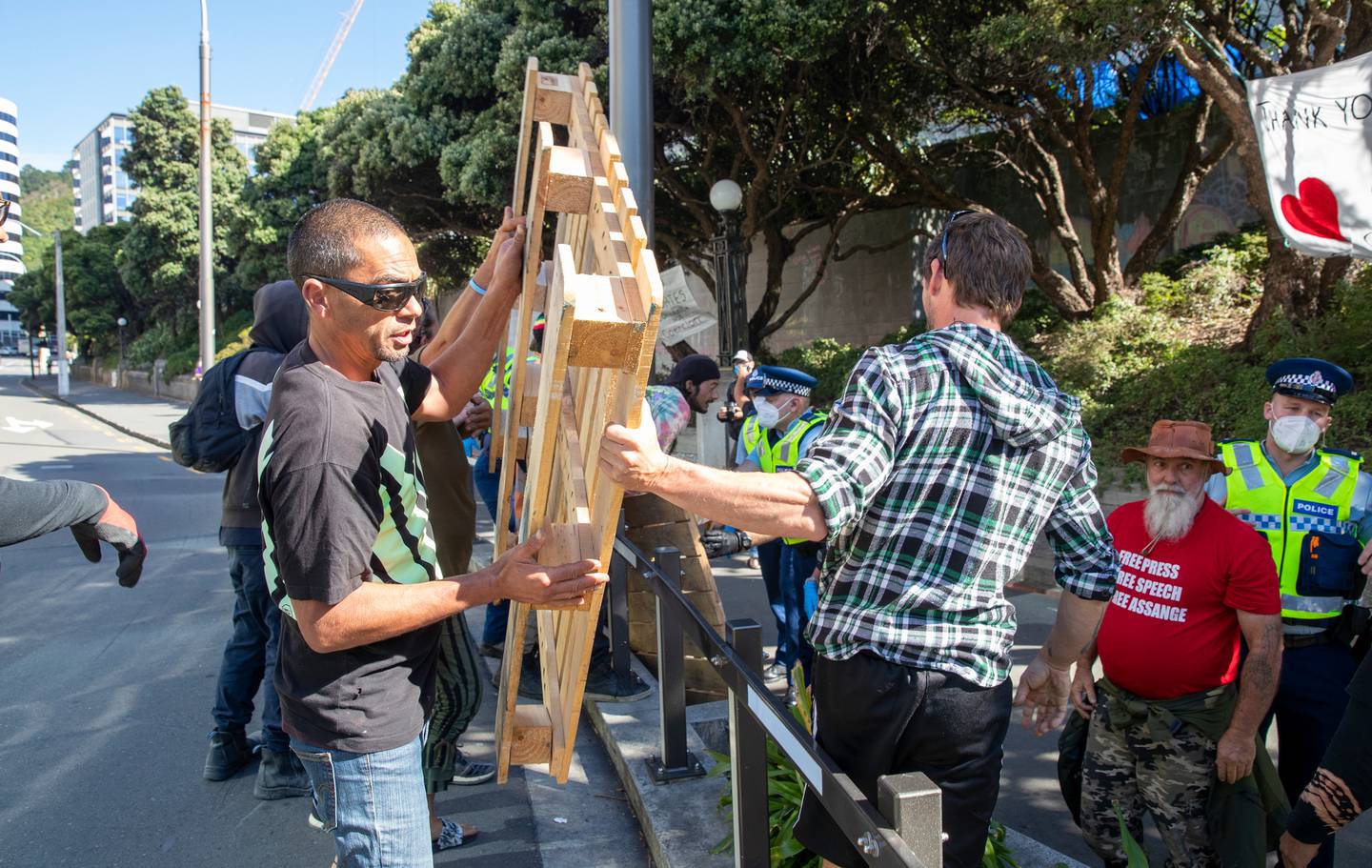 Police and protesters were in a scuffle after protesters attempted to bring in pallets on day 22. Photo / Mark MitchellÂ
