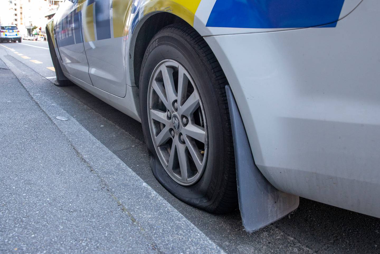 A police car parked on Featherston St with let down tyres. Photo / Mark MitchelÂ