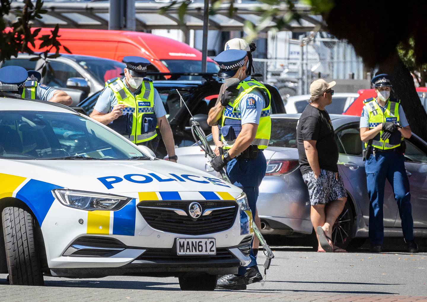 Police were also seen confronting three men near the Wellington Railway Station in the afternoon. An officer could be seen carrying what appeared to be a spear gun.Â