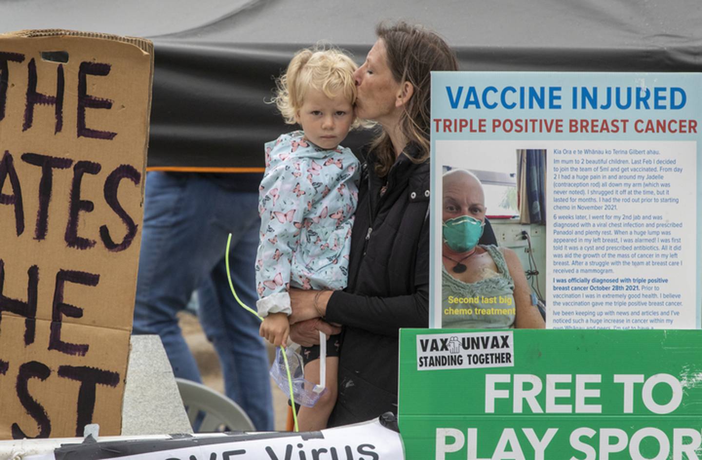 A protester kisses a child at the Parliament occupation. Photo / Mark MitchellÂ