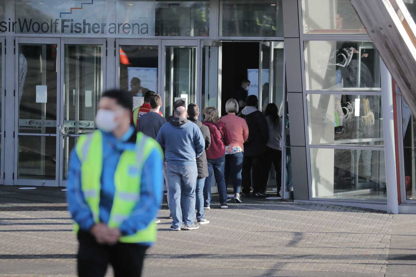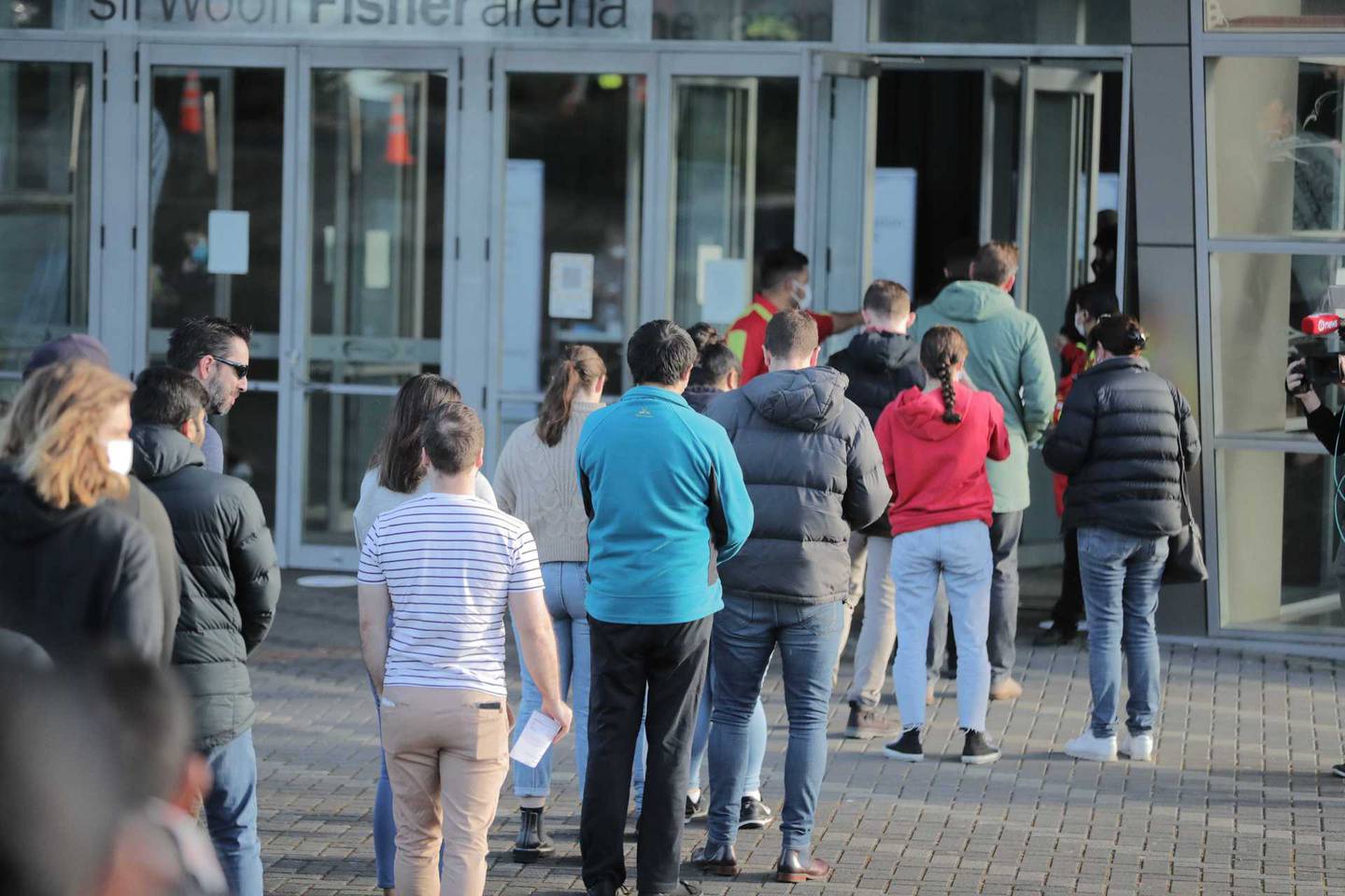 Crowds are beginning to gather in Auckland's Vodafone Event Centre for New Zealand's first mass vaccination event. (Photo / Michael Craig)