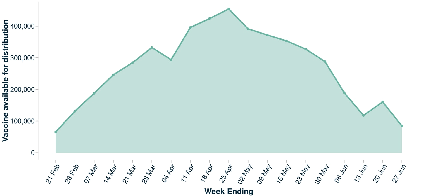 Stocks of vaccine available for distribution have fallen below 100,000, a chart supplied by the Ministry of Health shows.