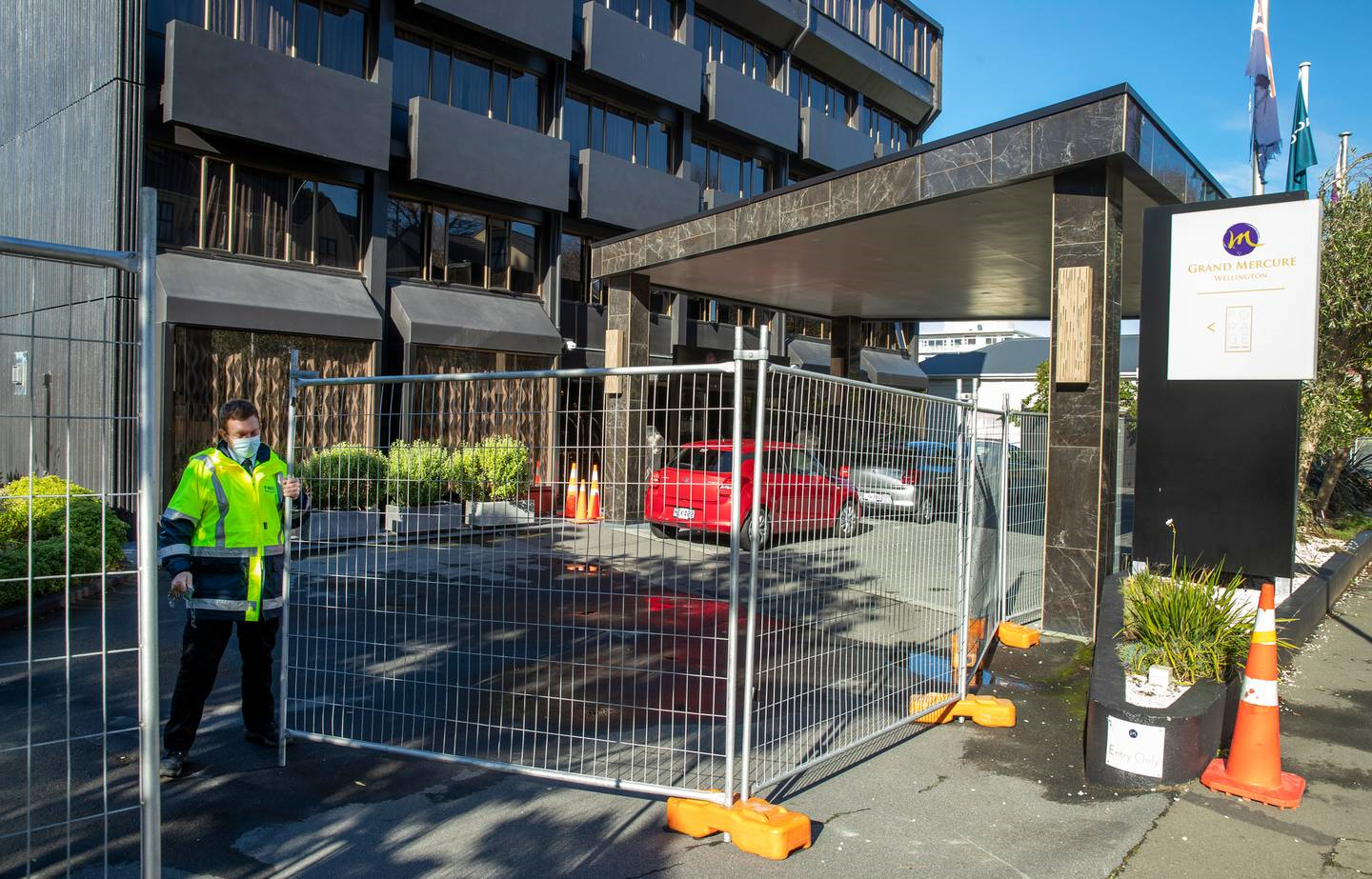 A security guard on duty outside the Grand Mercure hotel in Wellington. (Photo / Mark Mitchell)