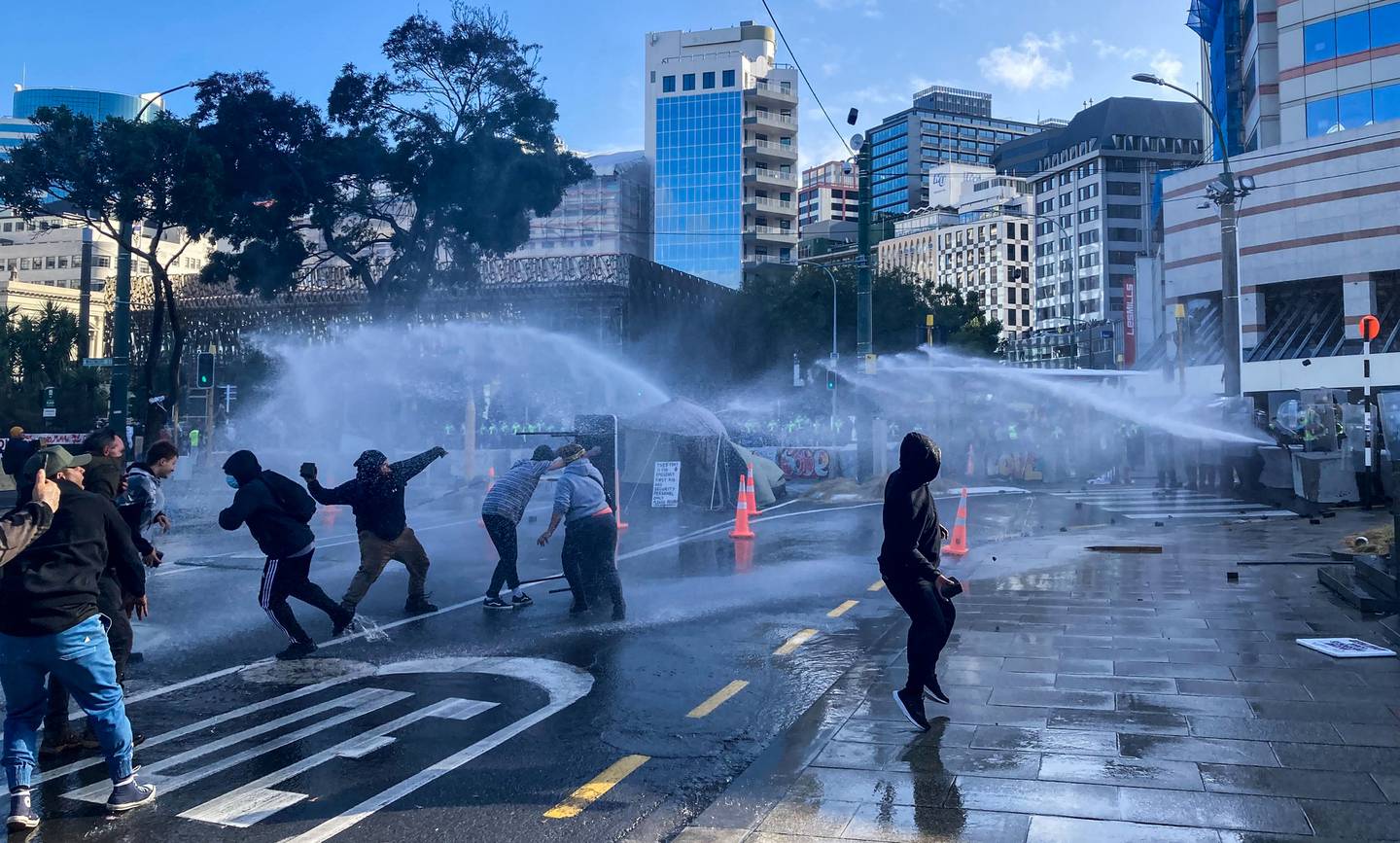 Protesters throw missiles at police after the anti-mandate camp was cleared from the grounds of Parliament. Photo / Michael Neilson