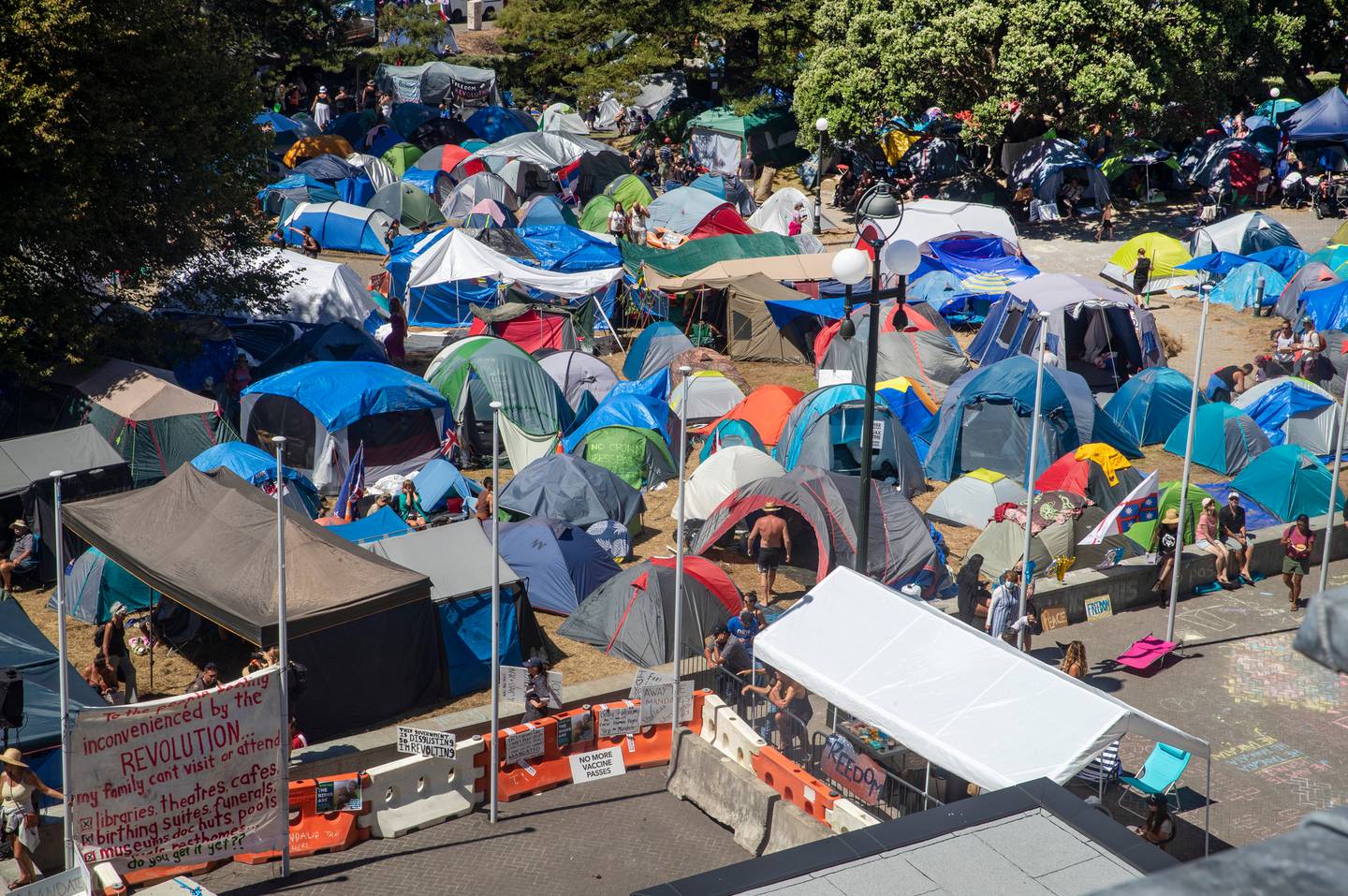 The protesters' village viewed from Parliament House's third floor on day 10 of the anti-mandate protest and occupation at Parliament. Photo / Mark MitchellÂ