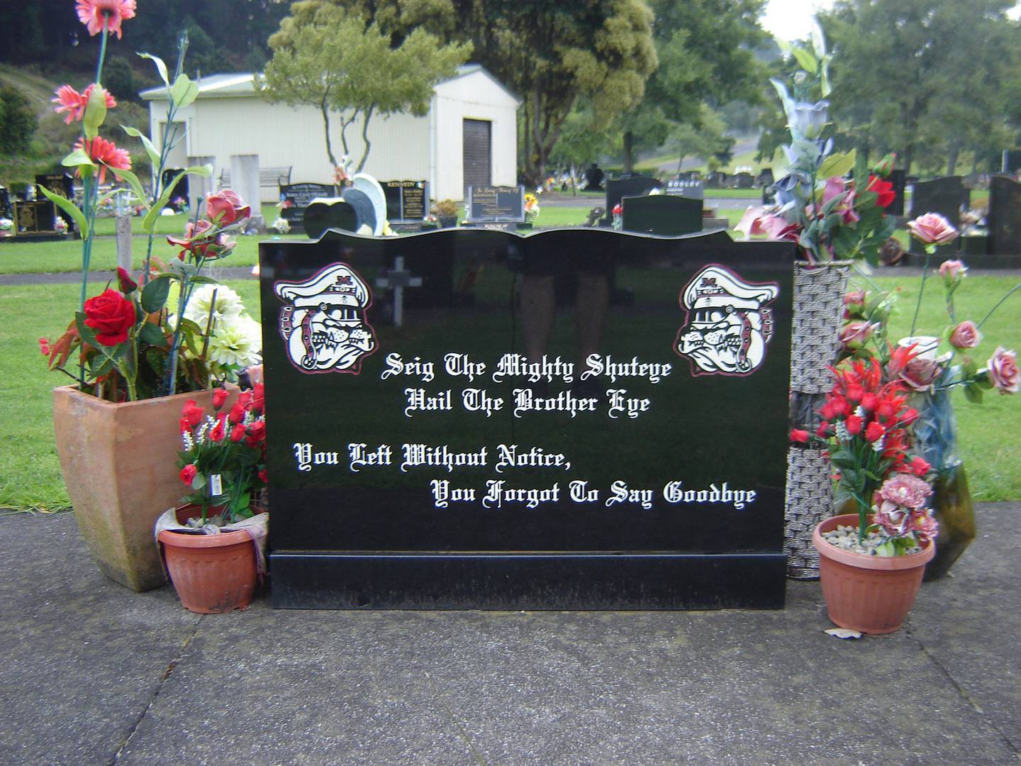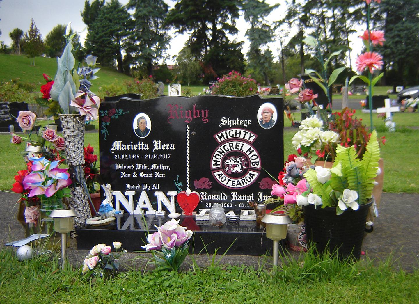 Stone's headstone – like those of fellow buried Mongrel Mob members Rigby and Craig Arthur Reid – are double-sided.Â
