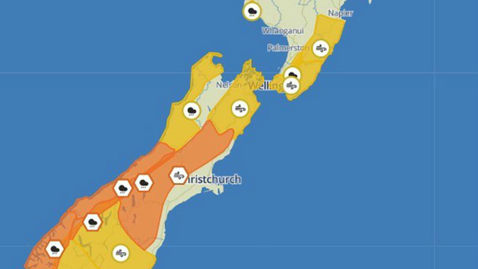 Virtually the entire South Island and much of the lower North Island is covered in more than a dozen wind and rain watches and warnings.
