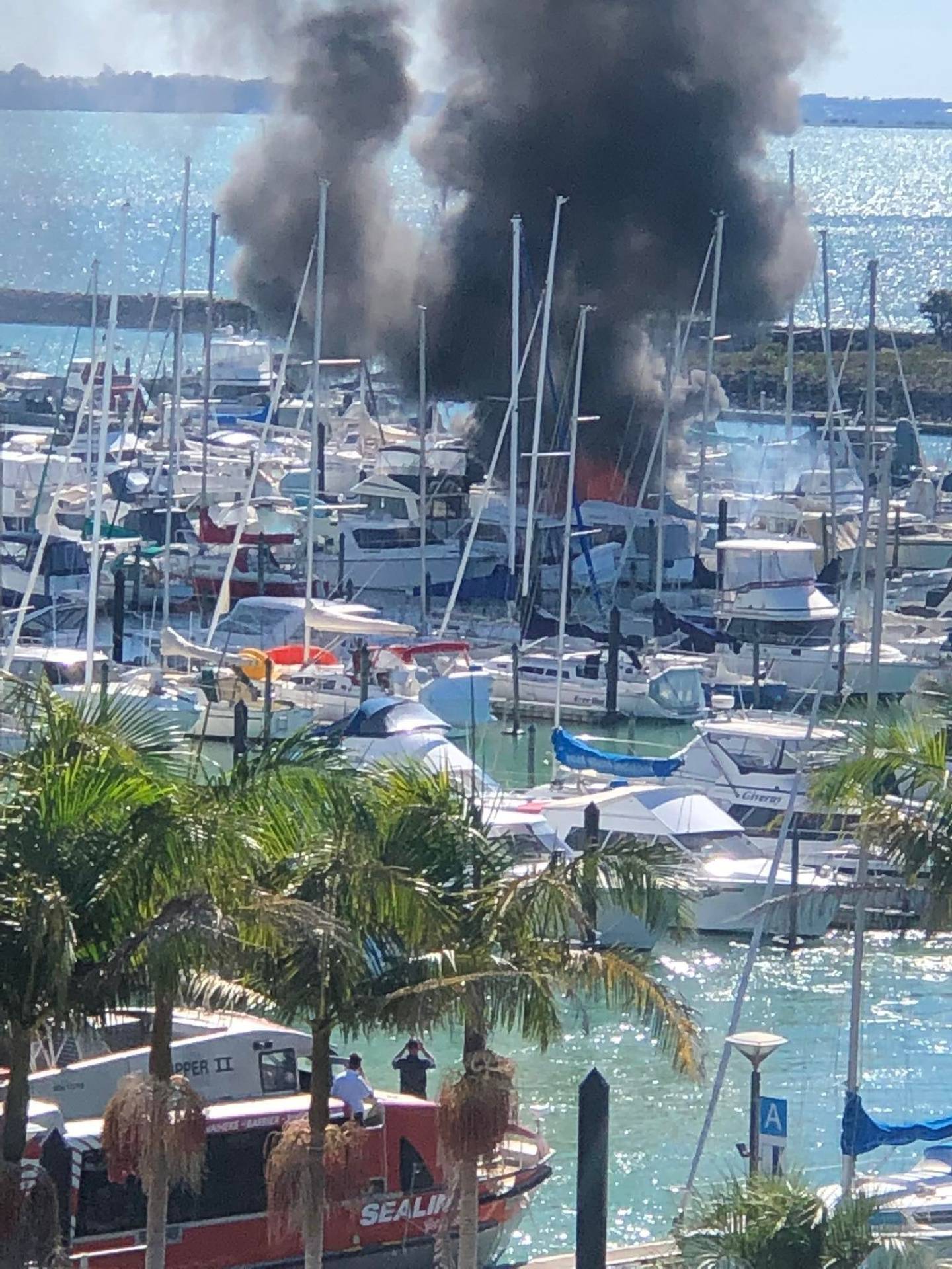 The fire started in the Pine Harbour Marina at Beachlands at about 3.30pm when a local eyewitness saw flames shooting from a motor yacht and then two men running "hard out" down the pier.Â