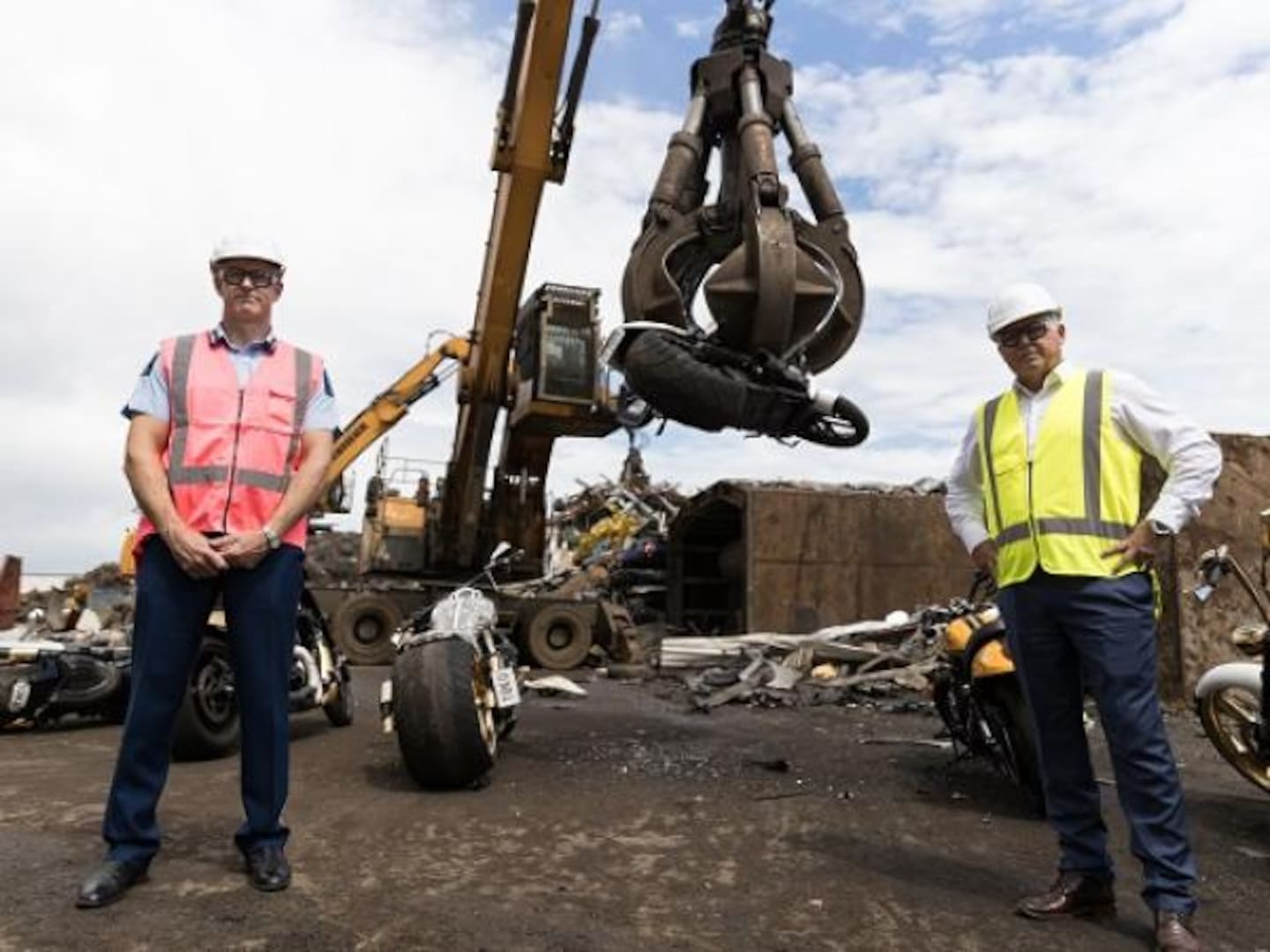 Six bikes impounded by police were scrapped in front of Police Minister Mark Mitchell, who says gangs have been policed harder under the coalition government.