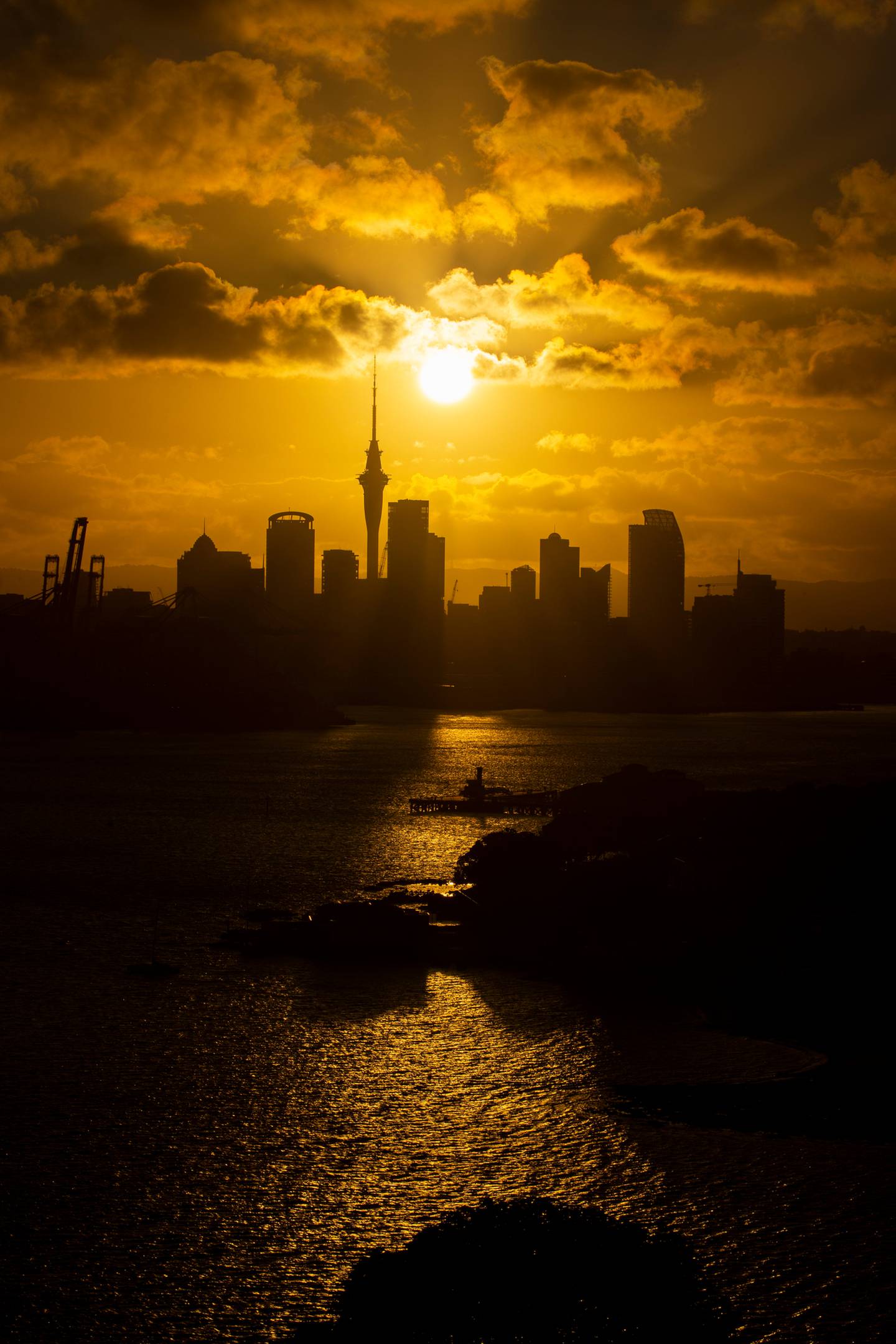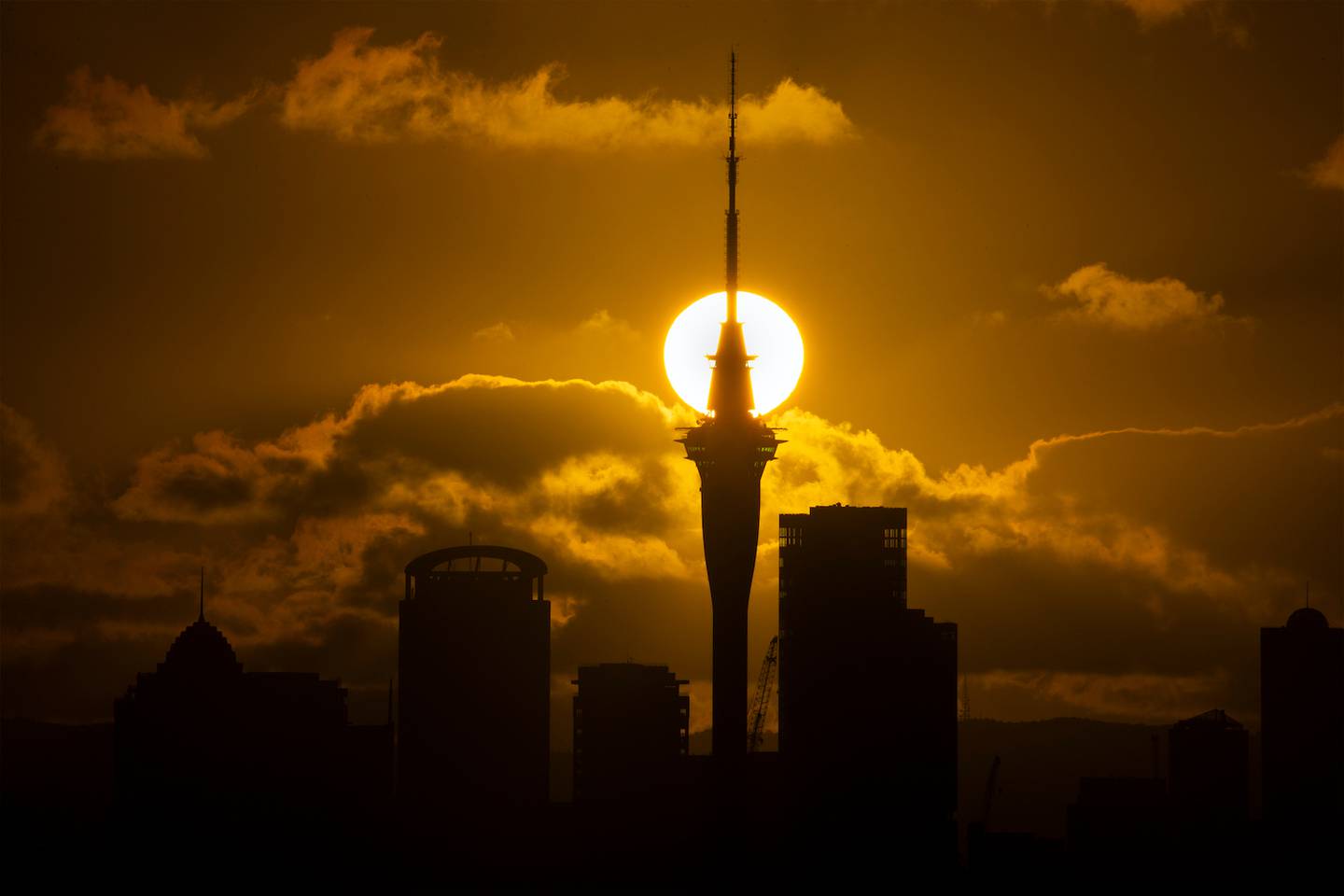 The sun goes down for the last time for 2021, Auckland. Photo / Brett PhibbsÂ