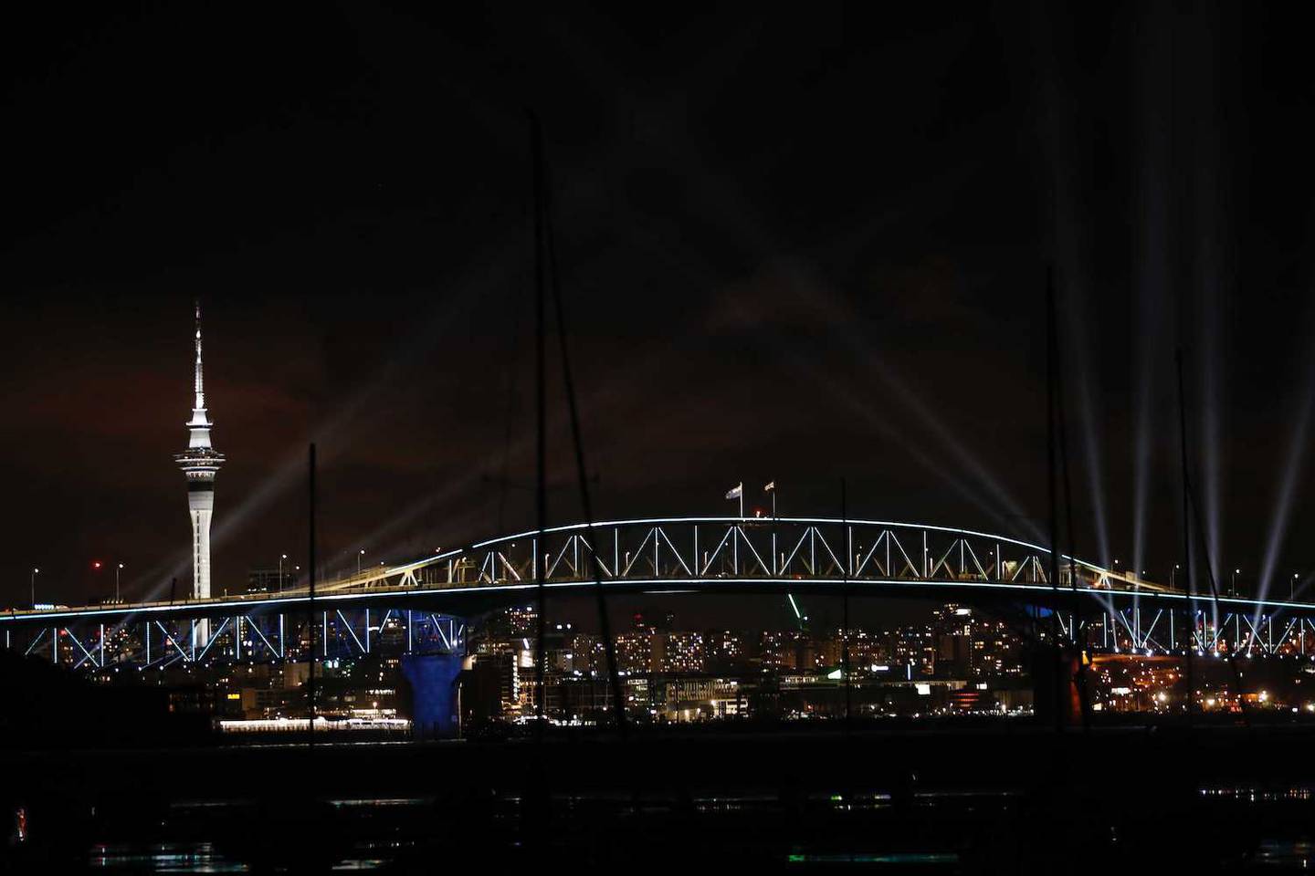 Laser show off the Auckland Harbour Bridge. Photo / Dean PurcellÂ