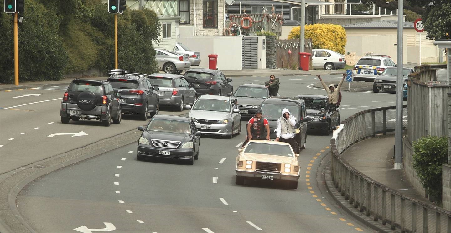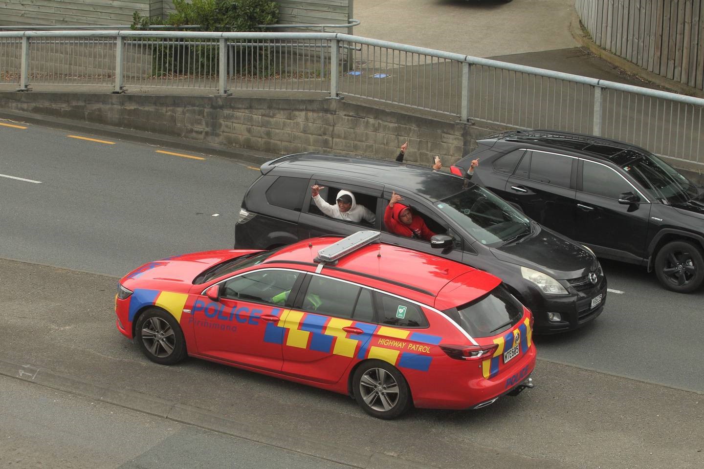 People hang out of the windows of cars in Porirua. (Photo / Jack Crossland)Â