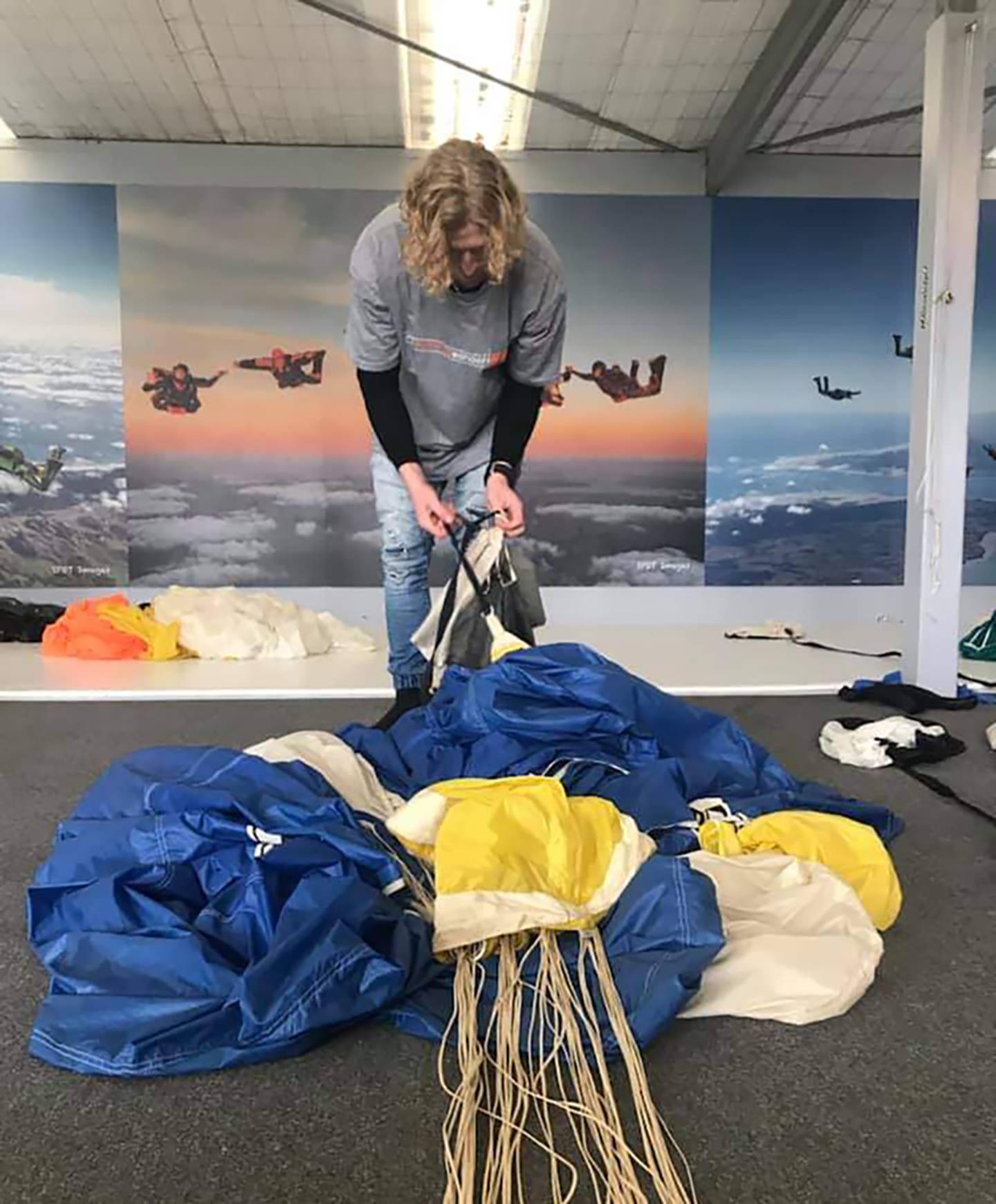 Skydiving graduate Theo Williams, seen here packing a parachute, was meticulous about safety, his parents say. Photo / SuppliedÂ