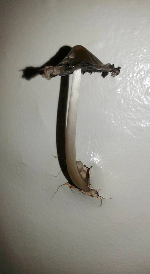 The wall backs on to the laundry and had been damp for a few weeks, but the mushroom sprouted during a spell of warm weather. She's since found mushrooms growing in the pot cupboard too.