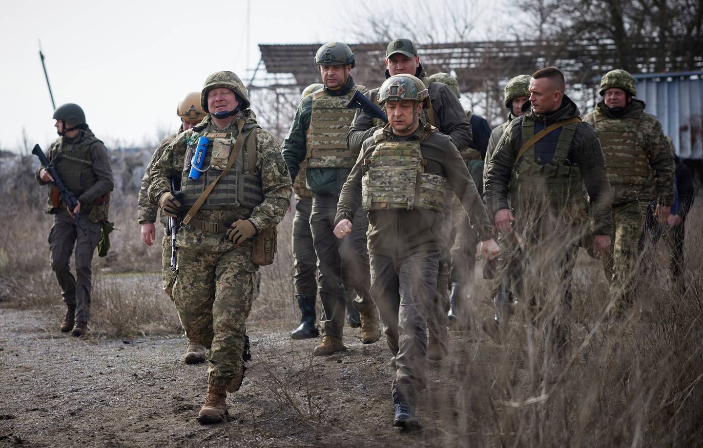 Ukrainian President Volodymyr Zelenskyy (centre) pays a visit to the front line in Donetsk region. Photo / APÂ