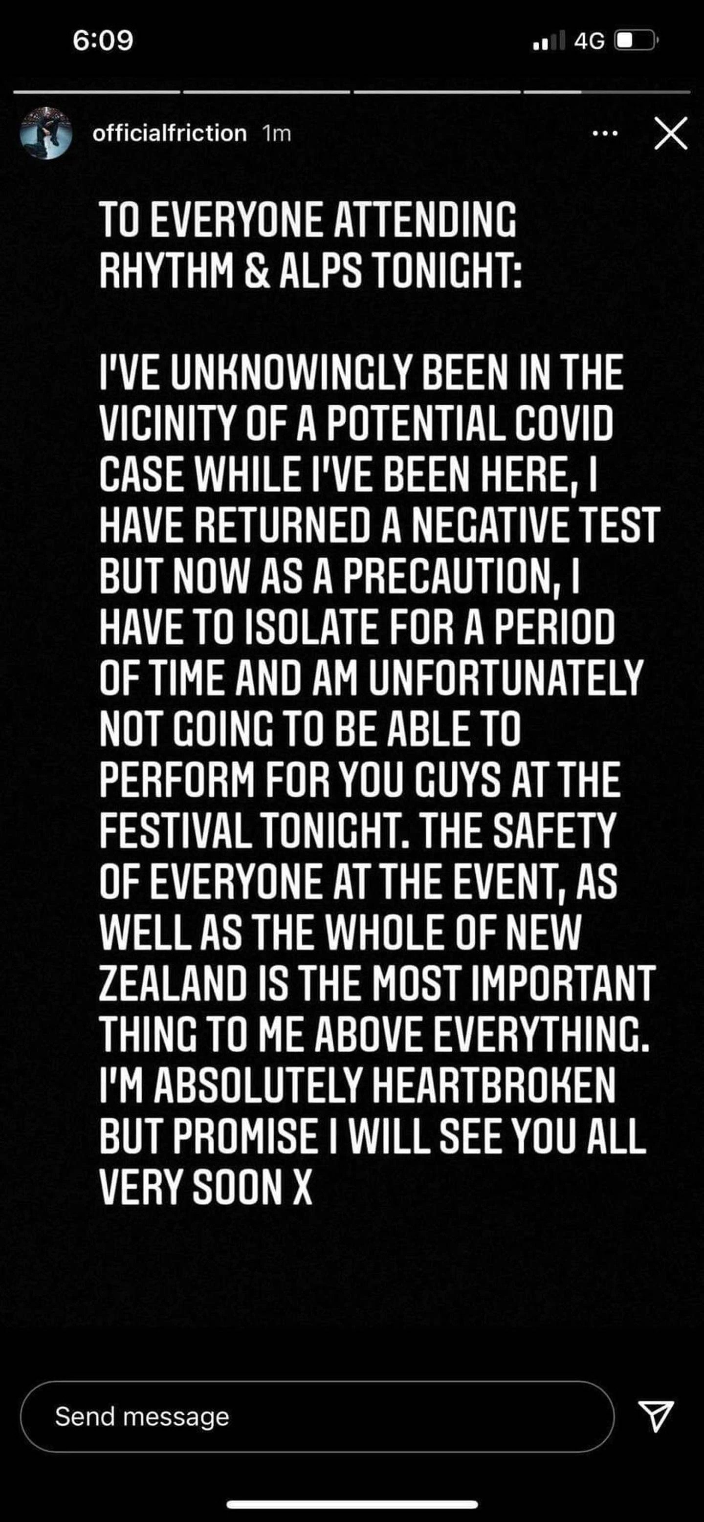 DJ Friction, who was scheduled to play at the Rhythm & Alps music festival in Cardrona Valley on Wednesday night, pulled out because he was "in the vicinity of a potential Covid case" and was told to isolate despite returning a negative test.Â