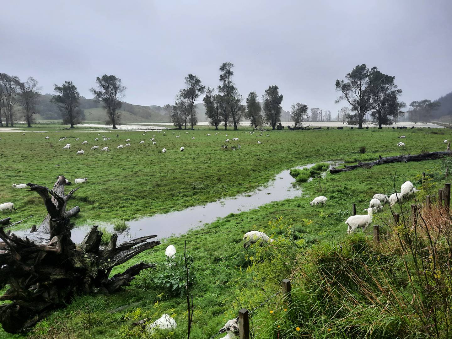 Floodwaters rise on farmland near Tolaga Bay on the East Coast. Photo / Neil Reid