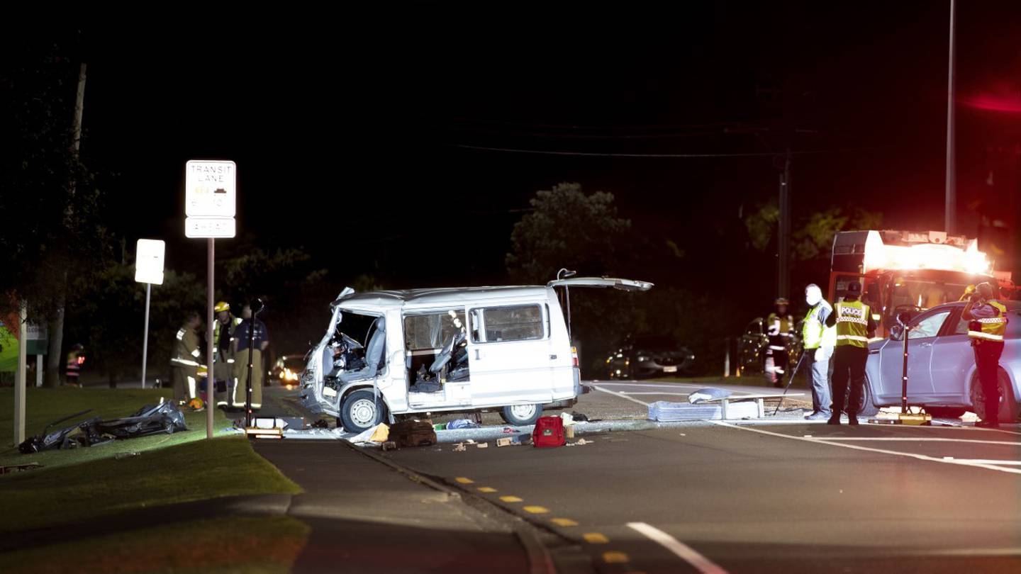 A badly damaged van left straddling a lane on East Coast Rd following last night's crash. Photo / Hayden WoodwardÂ