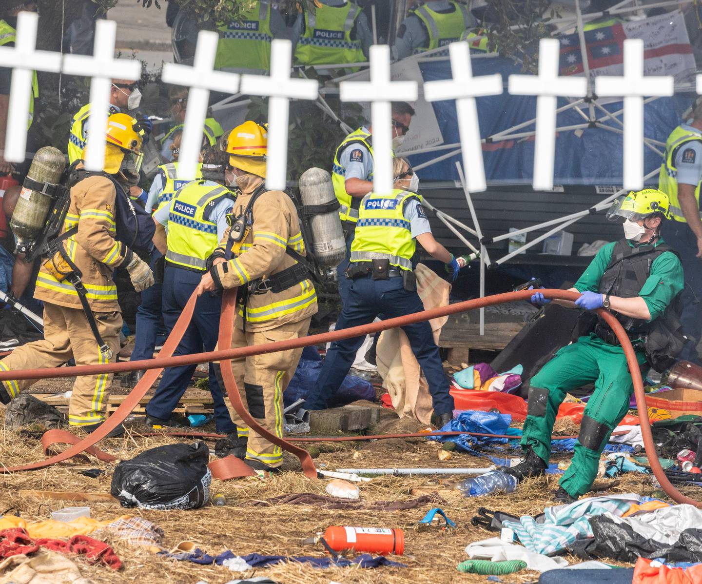 Among the chaos of today's events, a fire broke out among some tents close to the Pōhutukawa trees which line the edge of the lawn outside Parliament.