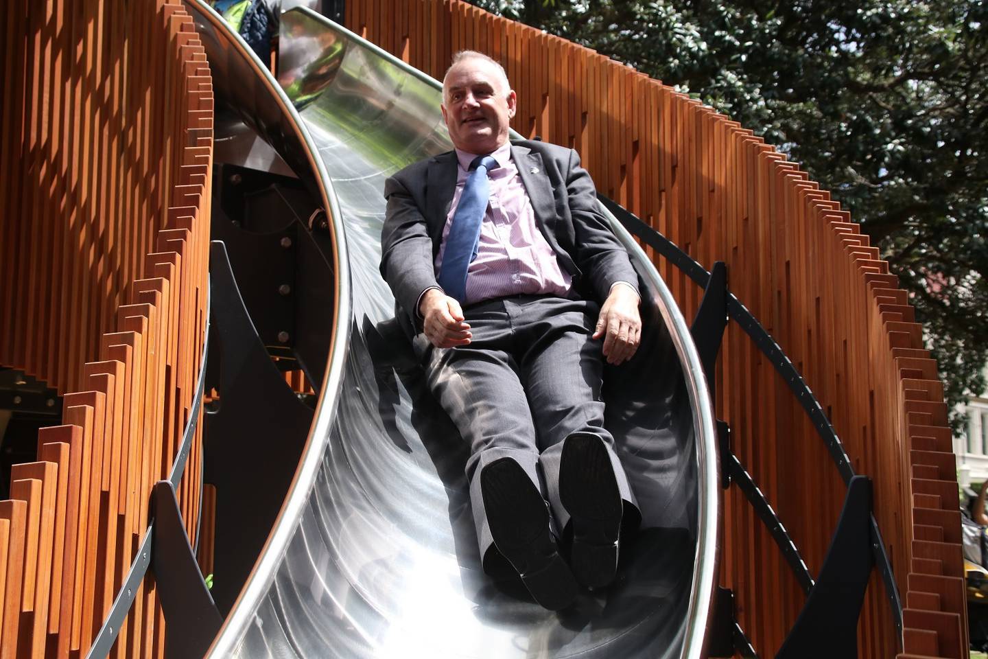 Speaker Trevor Mallard tests the slide at its opening in November 2019. Photo / Office of the Clerk