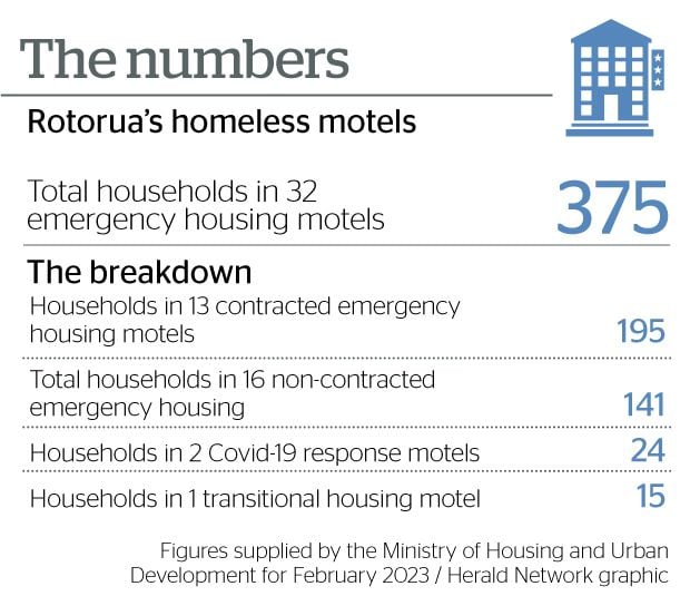 There are 13 contracted emergency housing motels in Rotorua, which are overseen by the ministry and run by social services agencies including Wera Aotearoa, Visions of a Helping Hand and Emerge Rotorua.