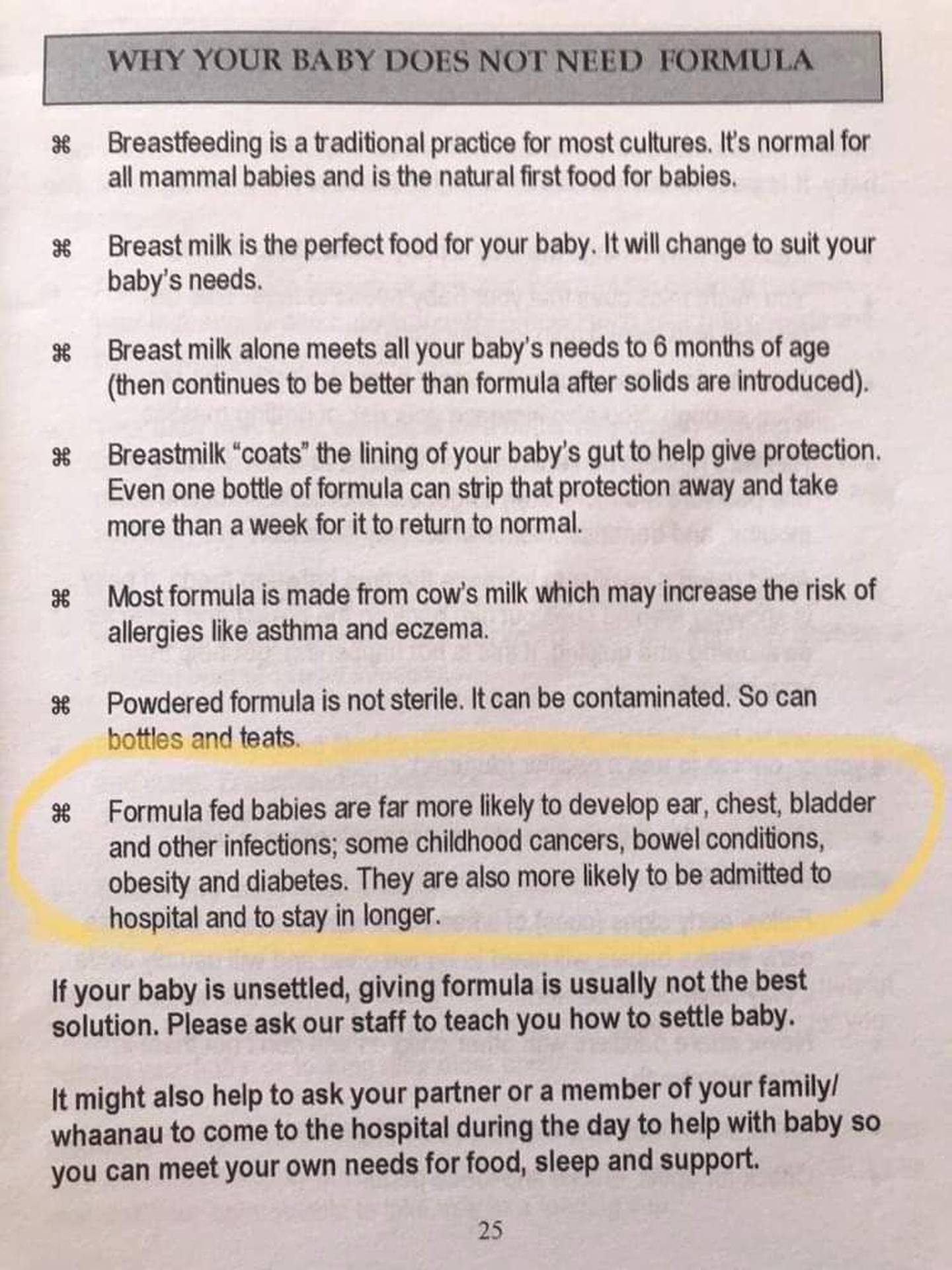 Fury has sparked online after a new mum was given a pamphlet by Middlemore Hospital staff saying formula-fed babies are more likely to develop childhood cancers and obesity.Â