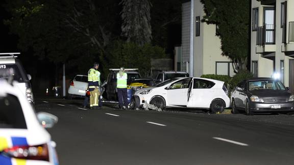 A ute crashed into a number of parked cars in Randwick Park, near Manurewa, South Auckland overnight. Photo / Hayden WoodwardÂ