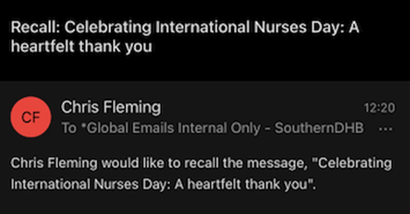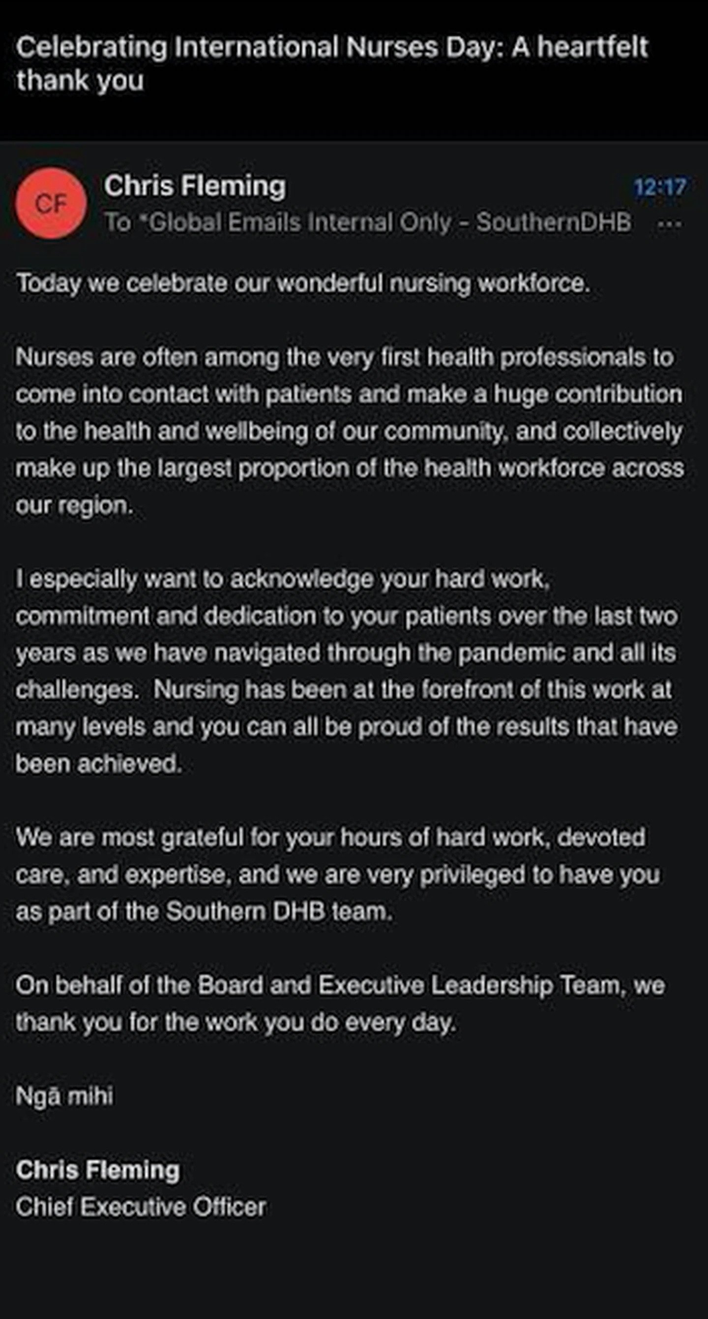 An email sent by the Southern DHB chief executive acknowledging the hard work of staff on International Nurses Day is at the centre of controversy – because he didn't actually write it.Â