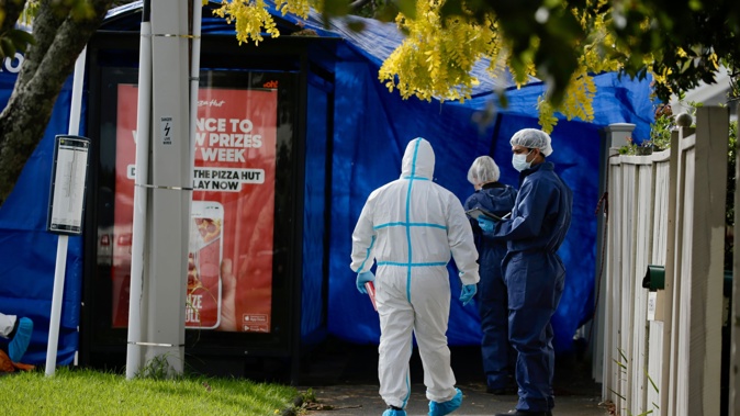 Police investigate after a fatal bus stop attack in St Johns. Photo / Alex Burton