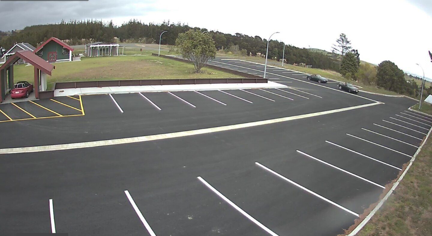 Security footage shows three Mazda mx5s drive onto the marae property. Two remain in the carpark while one flippantly drives their vehicle through the waharoa (entrance archway) and onto the ātea (courtyard) to do skids.
