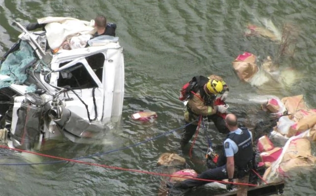 A large truck and trailer unit had smashed through a barrier and continued 50m down into the gorge, only coming to a stop when it was partly submerged.