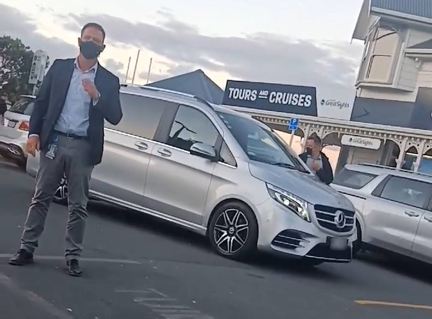 The video, shot from inside the vehicle that attempted to block the government car, then shows the group following the Mercedes through Paihia as they joke about being arrested.