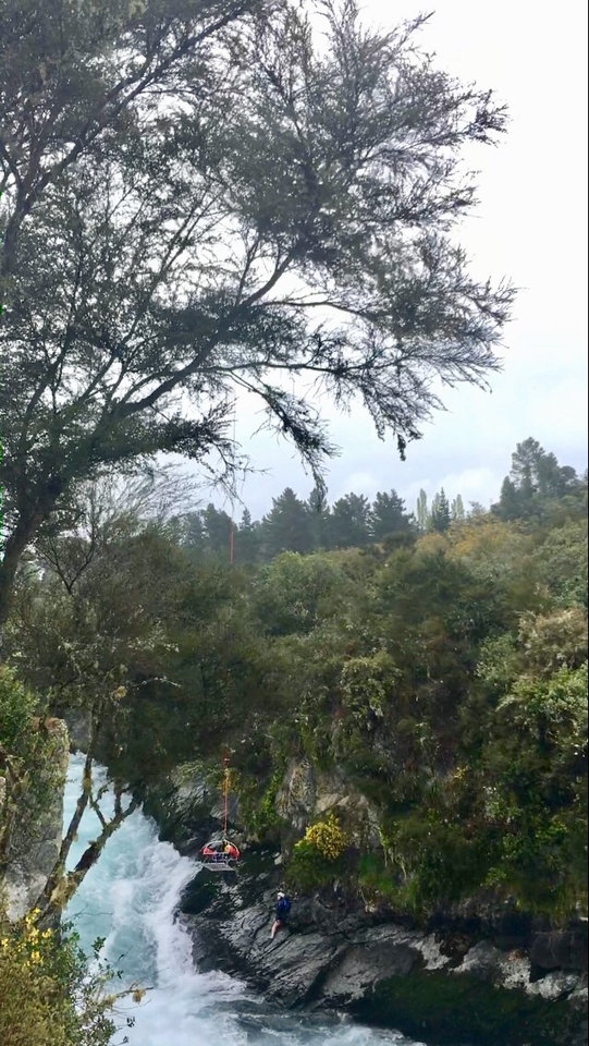 The stranded kayaker, bottom left, at Huka Falls. (Photo / Rosie Cronin)