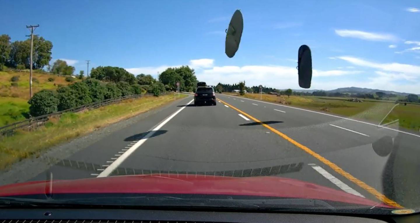 Dashcam footage captured the moment two surfboards went flying off the back of a car, nearly hitting tailing traffic. Photo / FacebookÂ