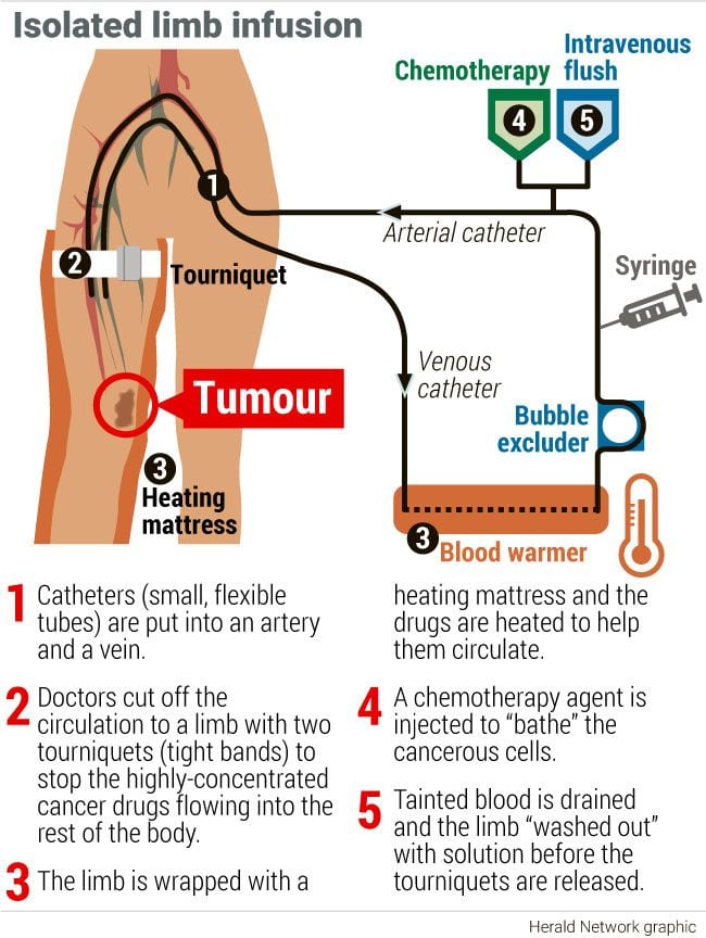 Essentially, a concentrated dose of chemotherapy is injected into the leg while it is cut off from the rest of the body’s blood circulation with a tourniquet, bathing the cancer cells, and after the drug is “washed out” the tourniquet is released.