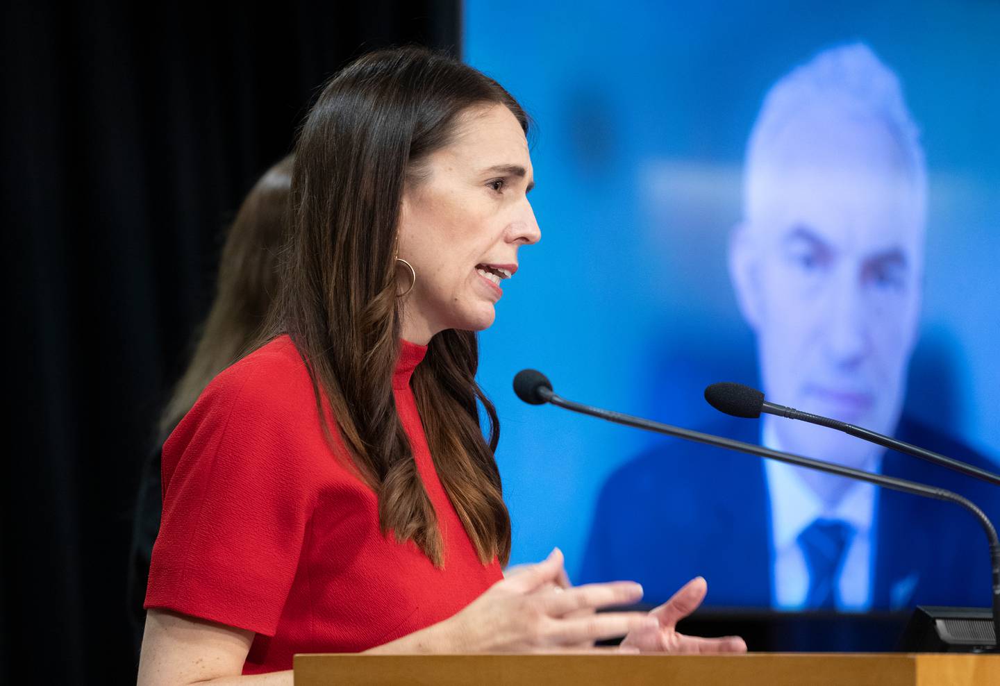 Prime Minister Jacinda Ardern and Tourism Minister Stuart Nash (on the video screen behind her) during their announcement over border reopenings. Photo / Mark MitchellÂ