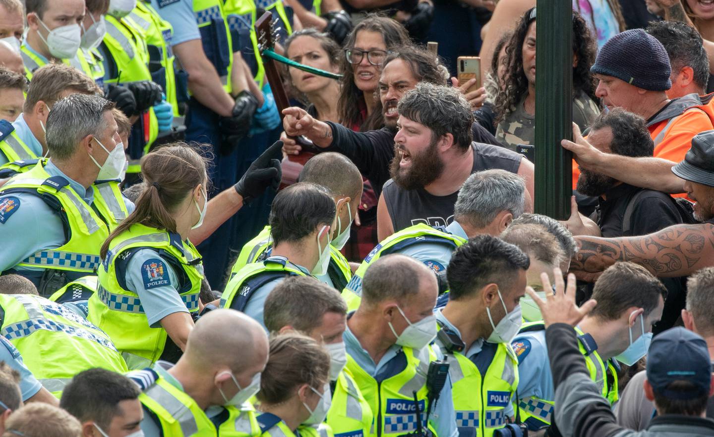 Police and anti-mandate protesters during their stand-off at Parliament, Wellington. Photo / Mark MitchellÂ