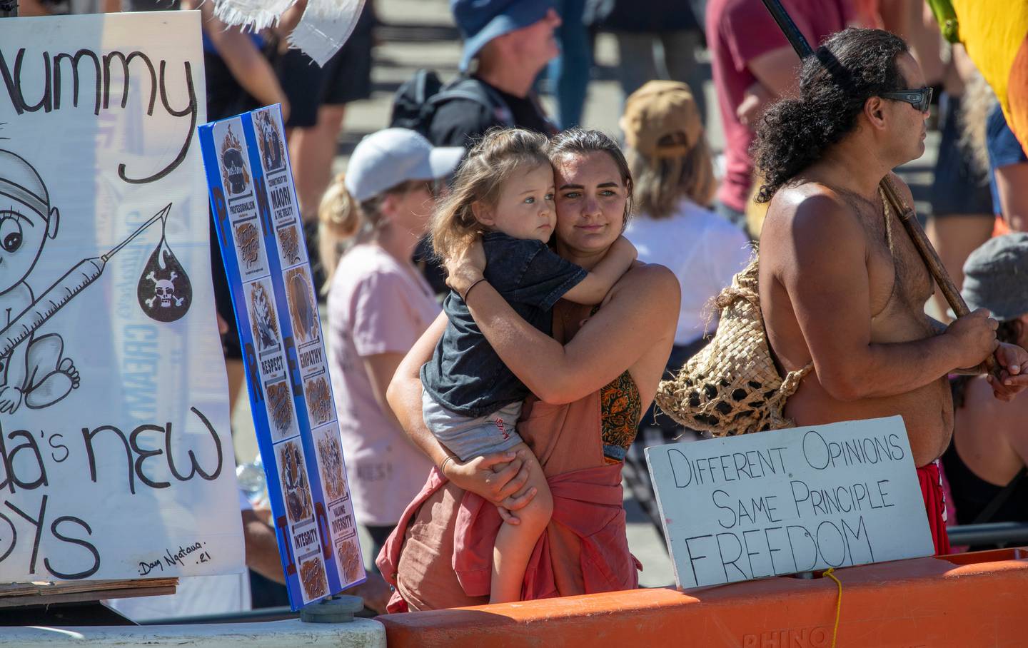 A woman with her child on day 10 of the anti-mandate protest and occupation at Parliament. Photo / Mark MitchellÂ