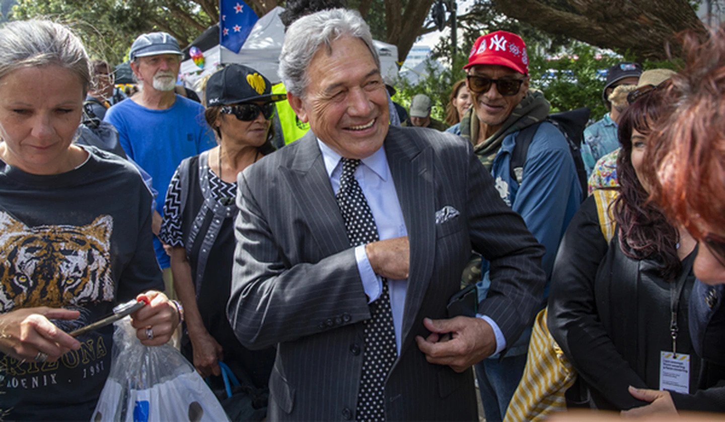 Winston Peters among protesters during day 15 of the Covid-19 convoy protest and occupation at Parliament. Photo / Mark MitchellÂ