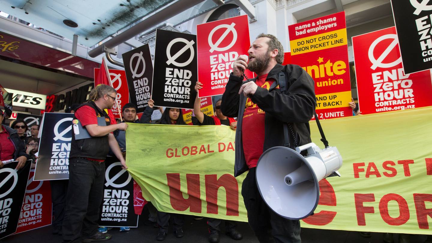 Unite Union, seen here in a previous action about fast food work, says a strike is being considered because hotel staff on low wages will soon lose weekly MIQ allowances. Photo / Nick ReedÂ