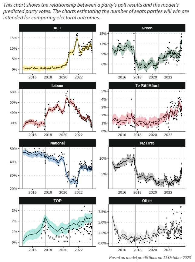 The Poll of Polls thinks Labour is likely to get 26.8 per cent, while National would get 35.5, the Greens are likely to poll 12.4 per cent, and Act is likely to get 11 per cent.