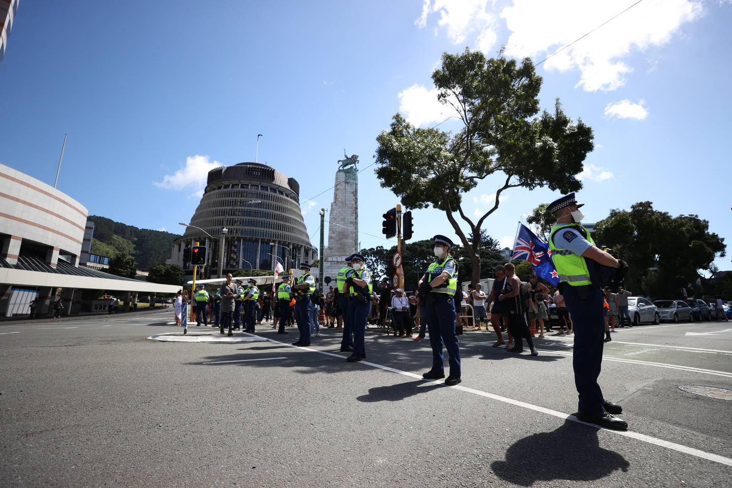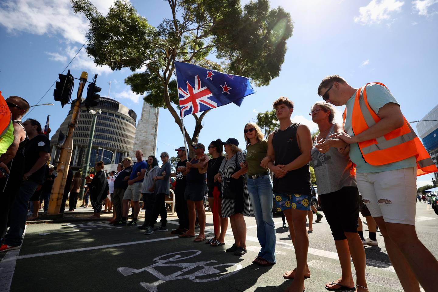 Protesters "holding the line" near the Beehive. Photo / George HeardÂ
