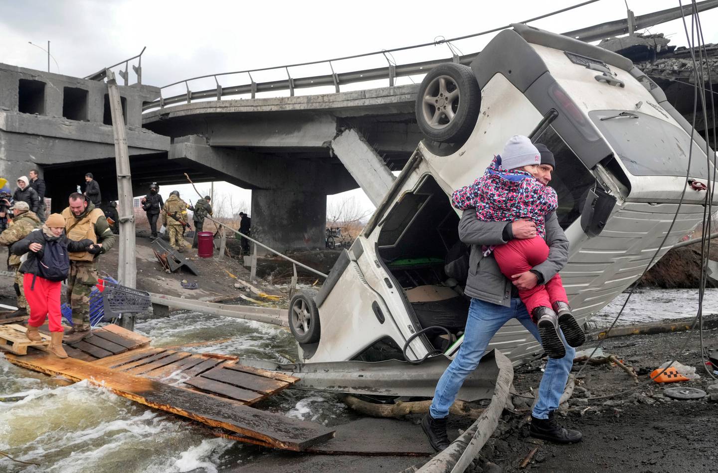 People cross an improvised path under a destroyed bridge while fleeing the town of Irpin close to Kyiv, Ukraine. Photo / APÂ